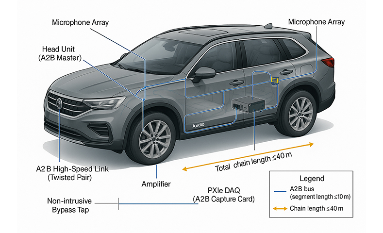 This test solution follows the principle of “do not disturb the original vehicle, restore the real link,” building a closed-loop process from issue capture and evidence solidification to reproduction and verification. Through non-intrusive bypassing, synchronous capture of protocol events and audio payloads, and long-duration high-speed storage with replayable analysis, the system can stably achieve multi-node, long-duration, reviewable A²B evaluation in both bench and in-vehicle scenarios, markedly improving localization efficiency and quantifying optimization gains. The solution has clear advantages in protocol-integrity assessment, evidence-chain creation, and team collaboration, providing continuous support for algorithm calibration, hardware iteration, and mass-production quality inspection.