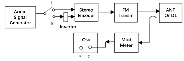a) Turn off the pilot signal. Apply a 1 kHz signal simultaneously to the L and R (via the inverter, with no amplitude change) inputs of the encoder, adjusting the modulation to 90%. The signal applied to the Y-axis of the oscilloscope is the s signal (M=0); measure its peak-to-peak amplitude.