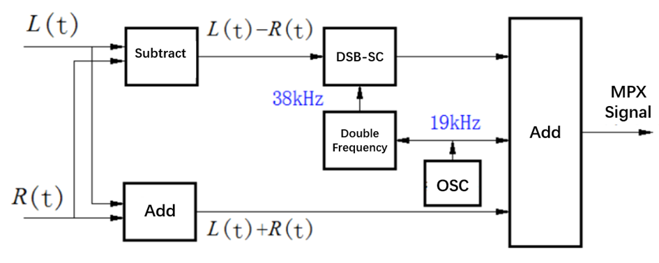 Based on FM stereo principles, the composite stereo signal mainly consists of three components: the M signal (L+R), the S signal (L-R), and a 19kHz pilot signal. As shown in the figure below, the 38kHz signal only acts on the S signal. Therefore, by turning off the pilot, making the left and right channels out-of-phase, and applying the same signal, the stereo signal retains only the S signal.