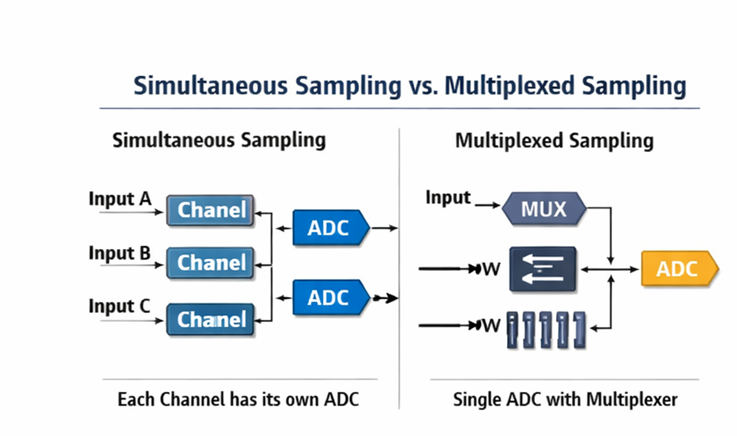 在同一张采集板卡内部,不同通道的同步能力首先取决于采样架构。行业里最常见的两类方式,一类是多路复用扫描采样,另一类是同时采样。多路复用方式通常由单个 ADC 轮流转换多个输入通道,虽然这些通道可以被放在同一个任务里,但它们并不是在同一时刻真正完成数字化;设备需要依赖 sample clock 和 convert clock 完成“先取样、再逐个转换”的过程,因此不同通道天然存在先后顺序。相反,同时采样架构会为每个通道配置独立 ADC,或者至少为每个通道配置独立采样保持链路,使所有通道在同一采样瞬间捕获输入信号,更适合相位分析、瞬态重建和多通道动态一致性要求高的场景。