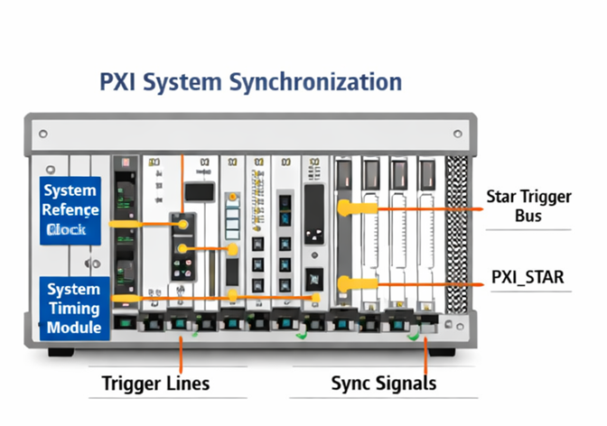 很多工程现场对“同步”的理解还停留在“几个设备一起开始采集”这个层面,但这其实只解决了最表面的启动一致性。真正的高精度同步,至少要同时满足四个条件:第一,系统内各采集节点共享统一参考时钟;第二,采样边沿在不同通道与设备间可对齐;第三,触发信号具有确定性的传输延迟和低偏斜;第四,在长时间记录过程中不会因为各自本振漂移而逐步失步。PXI/PXIe 平台之所以长期被用于高性能自动测试与精密测量,关键就在于它从机箱背板层面提供了统一参考时钟、触发总线、星形触发以及系统定时槽等同步资源,使“高精度同步采集”不再只是软件层面的对时,而是从硬件架构开始就被纳入系统设计。