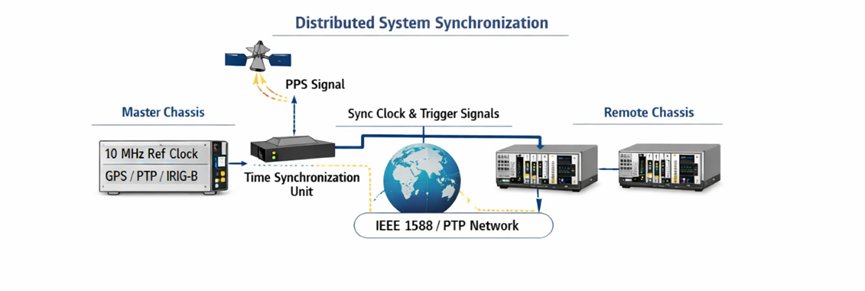 高精度同步数据采集的核心,不在于“设备一起开始工作”,而在于所有数据能否在同一时间基准下被可信地采集、记录和分析。在 PXI/PXIe 系统中,这套能力可以分为三层理解:同一张板卡内部依靠同时采样架构和通道匹配保证采样瞬间一致;同一机箱内依靠背板参考时钟、星形触发和系统定时槽实现多板卡低偏斜同步;不同机箱之间则通过公共参考时钟、统一触发以及 PTP、GPS、IRIG-B、PPS 等外部时间体系,把同步能力扩展到更大规模、更远距离的分布式系统。