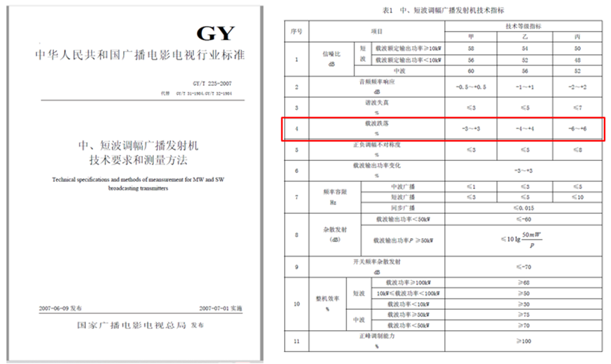 在广电行业的生产质检、日常运维及合规性核查中,载波跌落的测试方法与性能评估严格遵循《GY/T 225-2007中、短波调幅广播发射机技术要求和测量方法》标准执行。该标准明确界定了载波跌落的定义与计算公式,并通过 “载波输出功率变化” 这一关联强制指标划定分级要求:甲级发射机≤±3%、乙级≤±4%、丙级≤±6%,该分级标准是发射机性能判定、合规审查的法定依据,为规范广播频段信号秩序、避免设备间干扰提供了核心技术支撑。