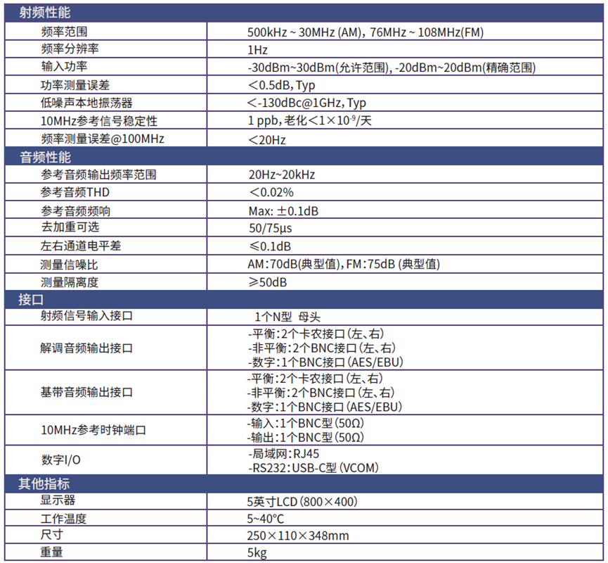 设备可实时解调 AM/FM(单声道和立体声),可测试载波功率、频率偏差、AM 调幅度、 FM 频偏及导频信号相关参数。设备支持实时输出解调后的音频信号。设备可配置音频发生功能,可输出基带音频信号,支持左右声道电平和频率的独立设置,同时具备数字(平衡)及模拟(平衡及非平衡)音频输出接口。设备具有音频分析功能,可分析解调后的基带音频信号,支持频域和时域分析,可显示音频的频谱和波形。