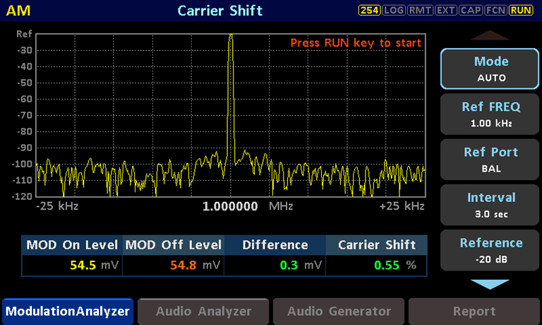 1、在Modulation Analyzer的上拉菜单中进入Carrier Shift界面,界面右侧Mode设置为AUTO,Ref FREQ设置为1kHz,Ref Port根据连接接口选择UNBAL/BAL/DIG,按下右侧按键区RUN,等待几秒钟即可在Carrier Shift栏中读取载波跌落值。