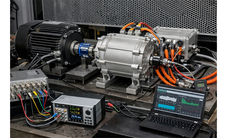 本方案面向汽车电机(驱动电机、转向电机、泵/风扇电机等)的研发与验证,提供一套以扭矩为核心指标的测试与分析方案。汽车电机的工程价值最终体现在“输出轴能输出多大扭矩、扭矩是否稳定、不同工况下扭矩响应是否满足要求”,因此方案以扭矩、转速及其派生的机械功率为主线,同时同步采集电压、电流等电参量以及温度等环境参数,建立“机械输出—电能输入—效率与损耗”的闭环评价,为性能评估与问题定位提供可靠数据支撑。