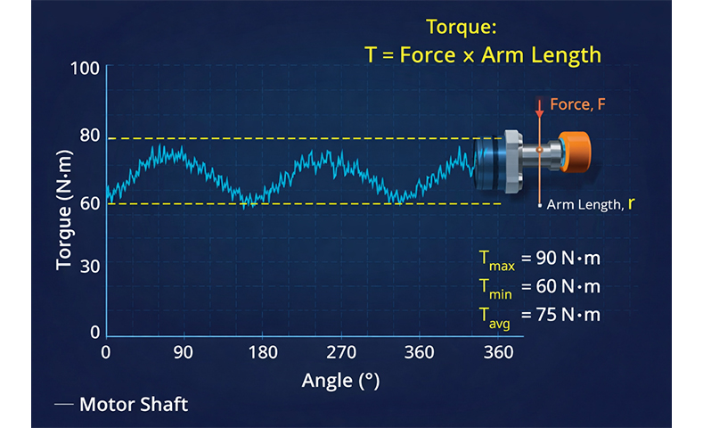 扭矩是表征力使物体绕轴转动效果的物理量,可通俗理解为“把轴拧动/带动负载的劲”。在最常见的场景下,扭矩等于施加力与力臂的乘积(F×r),单位为 N·m。对电机而言,扭矩越大代表输出轴带载能力越强;在相同功率下,转速越低所需扭矩越大。扭矩与转速共同决定机械输出功率:P_mech = 扭矩 × 2πn/60(n 为转速,单位 rpm)。结合电功率即可计算效率与损耗;便于对不同电机、不同控制策略与不同工况做量化对比。