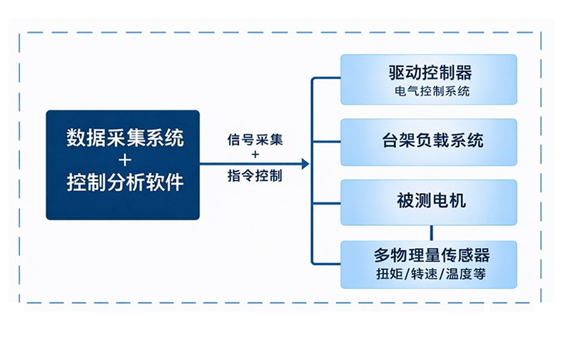 该方案通过硬件与软件的深度集成,实现对电机电能输入、机械输出及关键运行状态的综合测试管理,适用于研发验证、对标分析以及台架/整车综合测试等场景。测试系统结构示意图如下: