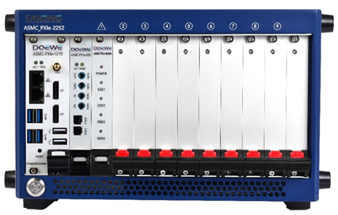 控制、存储与采集模块基于 PXIe 模块化架构集成在同一机箱内,可组合使用 ASMC PXIe 2252 高带宽混合背板机箱、PXIe 1216 嵌入式控制器及 PXIe 8016 高速存储卡,实现设备调度、数据处理与高速缓存。机箱提供稳压供电、强化散热与智能监控,支持多机箱同步;控制器提供高性能计算与高速 PXIe 交换通道;存储卡提供大带宽连续写入能力,满足电机功率测试长时间、多通道同步记录需求。机箱内可根据项目配置电压/电流采集、温度、振动及总线接口等板卡,实现电参、机械与状态量的一体化采集。控制与存储模块的产品示意图如下: