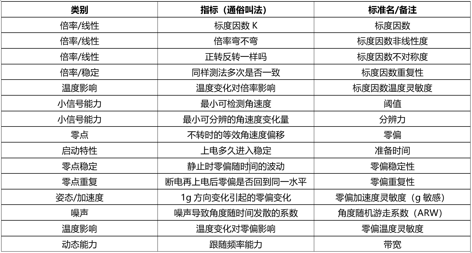 该规范覆盖芯片级测试的核心性能要素,包括:标度因数及其非线性度、不对称度与重复性;零偏及其稳定性与重复性;零偏温度灵敏度、零偏加速度灵敏度;角度随机游走(ARW)与带宽等。这些指标能够直接表征 MEMS 陀螺仪的静态精度、噪声水平、环境敏感性与动态响应能力。与此同时,规范对校准环境条件与关键设备配置提出了明确建议(例如速率转台、温箱、角振动装置与位置装置等及其推荐指标),便于将测试系统配置、设备选型指标与测试流程设计形成一致的工程实现路径。