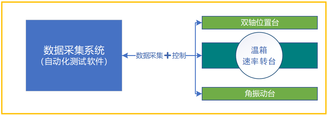 方案系统由:数据采集与分析系统、自动化测试软件、角振动台、双轴位置台、温箱内置速率转台一体化系统组成,可覆盖静态、动态与温度相关的关键指标测试。数据采集与分析系统作为统一采集与控制平台,完成多通道同步采集、长时间记录与基础时域/频域分析;自动化测试软件运行于采集系统上,实现测试台联动控制、测试序列编排、数据自动处理、指标计算与报告输出。温箱内置速率转台提供温控下稳定角速度激励,用于标度因数及派生项、阈值/分辨力、温度灵敏度/温漂等测试;双轴位置台提供姿态精确翻转,用于零偏加速度灵敏度(g 敏感);角振动台提供可控角振动激励,用于幅频/相频与带宽等动态指标测试。测试系统结构图如下: